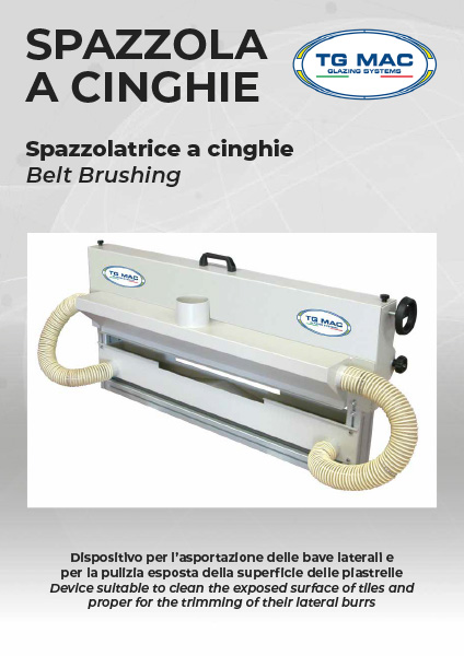 The belt brushing machine is a device used both for the removal of lateral burrs and for cleaning the exposed surface of the tiles. The brushing machine is made up of two belts equipped with bristles that slide transversely to the motion of the tile in opposite directions to each other.