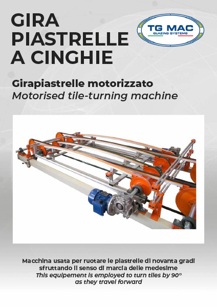 Machine used to rotate tiles through ninety degrees using their direction of travel. The motorized tile turner can be equipped with a rapid raising and lowering system to allow it to be used or excluded quickly from the glazing line without the need to dismantle the side.